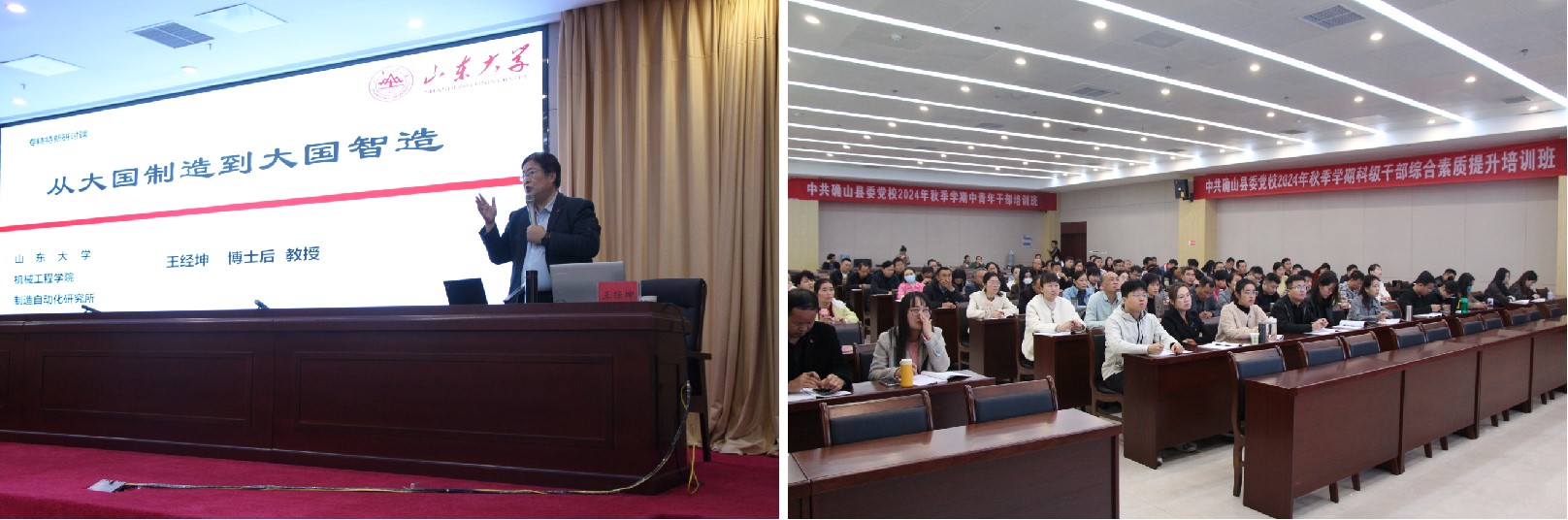 王经坤为确山县委党校2024年秋季学期科级干部综合素质提升培训班作题为《从大国制造到大国智造》的讲座,深入浅出地讲解了新型工业化、制造领域的数字化与智能化发展情境,剖析了确山县地理位置与产业链供应链差异化优势,介绍了智能制造典型应用场景相关知识,为确山县制造产业经济发展提供了合理有效的新思路。参加培训班的确山县广大干部对讲座反响热烈,双方积极互动,热情交流。