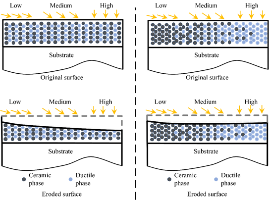 该专利基于脆性陶瓷材料和延性金属材料在不同冲击角度下的抗冲蚀性能差异,提出了变塑脆比(金属材料在金属陶瓷材料中的质量占比)以适应不同区域的冲击角度变化的按需增韧新方法,设计了切向渐变涂层新结构,揭示了冲蚀率与冲击角度、塑脆比之间的映射规律,开发了可变塑脆比的热喷涂涂层制备技术,提升了涂层材料的抗冲蚀性能。该专利不但对叶片气固两相流冲蚀防护、涂层材料多元增韧改性及其再制造修复等具有直接指导作用,对金属基复合材料和陶瓷基复合材料的设计、研发和制备也具有一定的学术和工程借鉴意义。