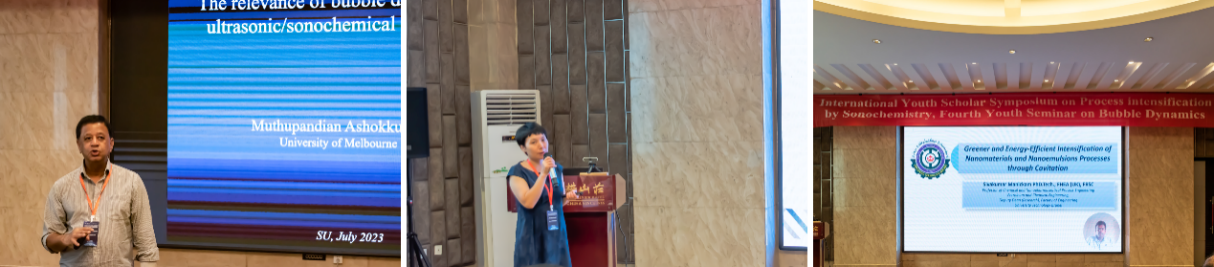 朱俊杰教授主持了特邀报告环节,Ashokkumar教授、王成会教授、Manickam教授分别作了题为《The relevance of bubble dynamics in ultrasonic/sonochemical processes》《Nucleation and dynamics of bubbles in a liquid cavity wrapped by elastic medium》《Greener and energy-efficient intensification of nanomaterials and nanoemulsions processes through cavitation》的学术报告。