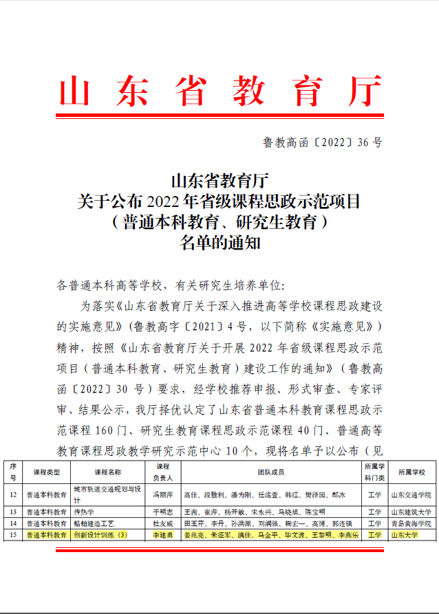 近日,山东省教育厅公布了2022年普通高等教育课程思政示范课程名单,beat365李建勇老师等负责的本科生课程《创新设计训练(3)》入选课程思政示范课程。