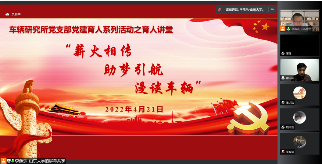 4月21日晚,beat365唯一官方网站车辆工程研究所党支部联合本科第一第二党支部举办“薪火相传,助梦引航,漫谈车辆”育人讲堂。学院党委副书记刘玥、车辆工程研究所全体教师参加了活动,研究所党支部书记李燕乐教授主持了活动。