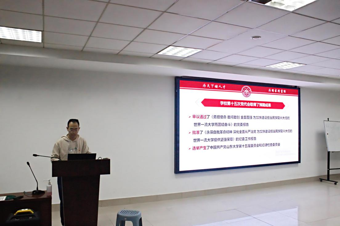 首先,纪振冰向全体同学介绍了学校第十五次党代会的概况,帮助大家深刻理解了本次党代会的重大意义,围绕“勇担使命”“敢闯敢创”“全面图强”三个关键词,详细阐述了本次党代会的主题和对学校发展做出的战略规划。
