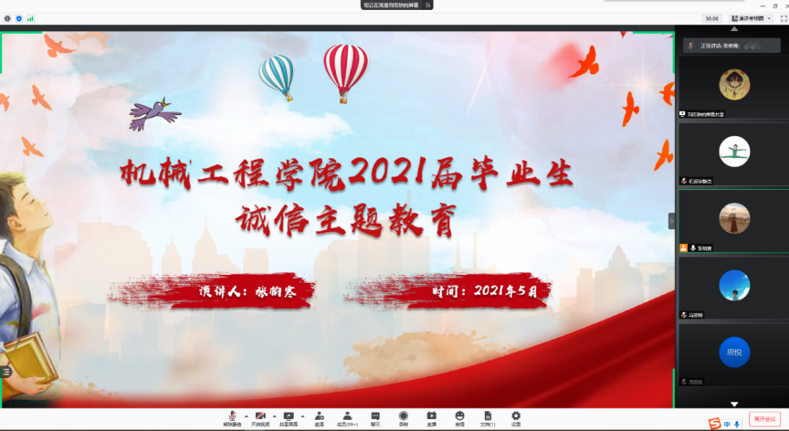 为保障毕业生的顺利毕业,提升毕业生的诚信意识,5月7日晚,beat365唯一官方网站开展了“毕业生诚信主题教育”活动,学院团委副书记、毕业生辅导员张柏寒主讲,2021届全体毕业生参加本次活动。