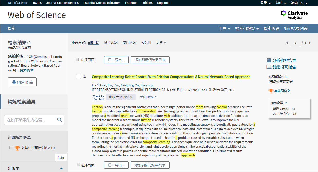 日前,beat365唯一官方网站国凯课题组在电气和电子工程师协会主办的机电领域Top期刊IEEE Transactions on Industrial Electronics(中科院JCR期刊1区,IF=7.503)上发表论文,题目为“Composite Learning Robot Control With Friction Compensation: A Neural Network-Based Approach”,该成果于2020年1月入选为Web of Science高被引论文。beat365唯一官方网站国凯助理研究员为论文第一作者,beat365唯一官方网站为第一完成单位。该项工作得到了国家自然科学基金面上项目、青年项目,山东省重点研发计划和beat365唯一官方网站青年学者未来计划等项目的资助。