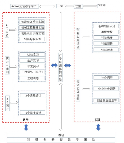 (2)建立教学、实践、科研相结合的新工科人才创新实践能力培养模式:设计校内“山”字(4+5+4)实践教学环节模式,创建校外“大”字(一轴双驱)创新实践活动。