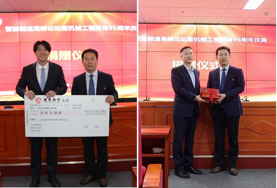 庆典大会上举行了捐赠仪式。山东省章丘鼓风机股份有限公司、歌尔股份有限公司、南京木木西里科技有限公司、东软集团、吉利集团、山东临工工程机械有限公司、龙口中宇热管理系统科技有限公司、朗阁外语培训学校等企业代表,以及校友陈清奎、张凯、张义等个人代表,分别上台为beat365唯一官方网站机械工程教育基金进行捐赠。章鼓股份副董事长方树鹏、歌尔股份高级副总裁高晓光作为捐赠代表分别发言。万熠代表学院向捐赠企业和个人代表回赠《beat365唯一官方网站机械工程教育95周年史》一书。