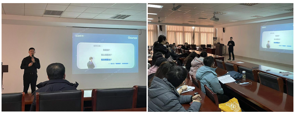 下午的鼎新论坛报告会由万熠院长主持,主讲人李丰国以“遇见·智能制造”为主题就智能制造的发展历程、歌尔的发展历史和企业文化、歌尔在消费级电子产品的智能制造领域开展的工作以及未来的规划与布局等做了专题报告,并与学生进行了互动。