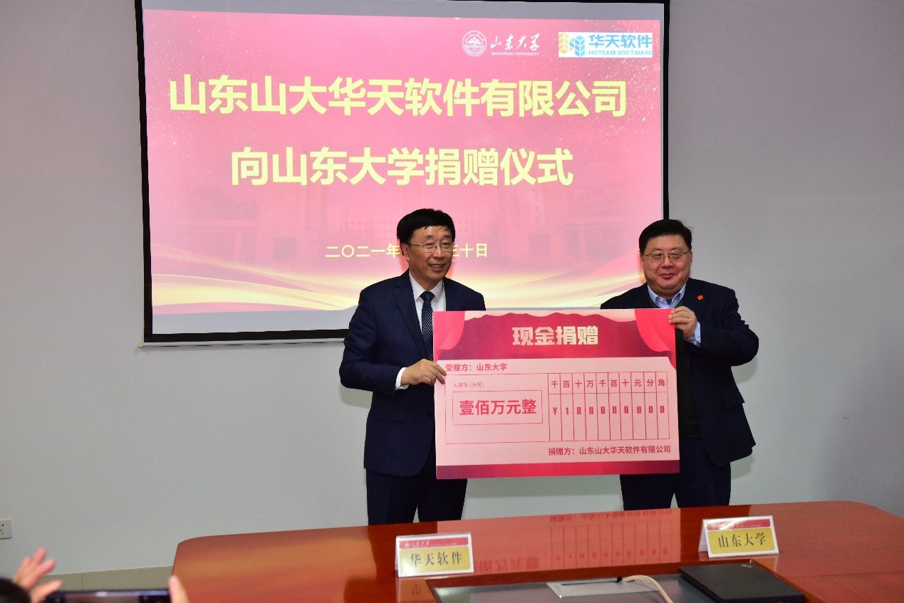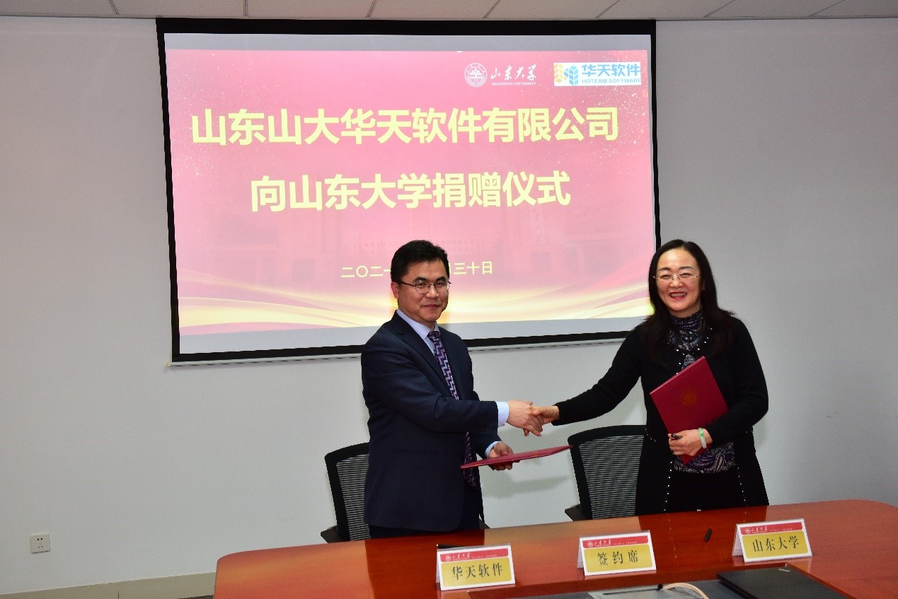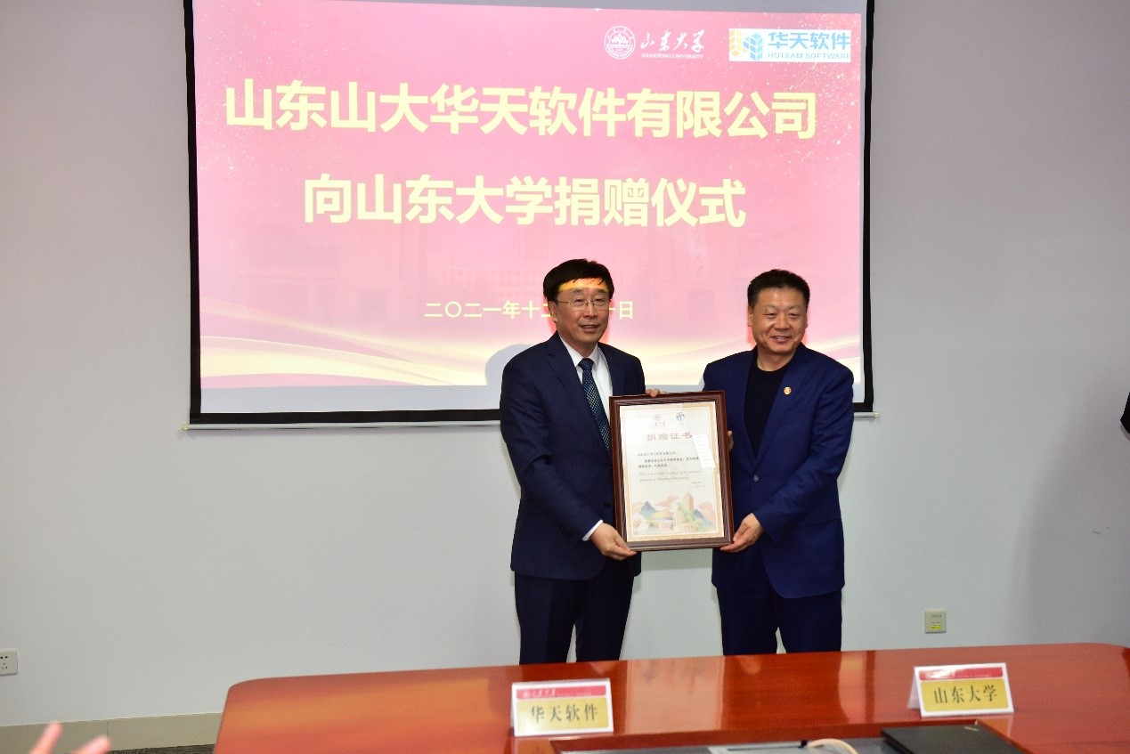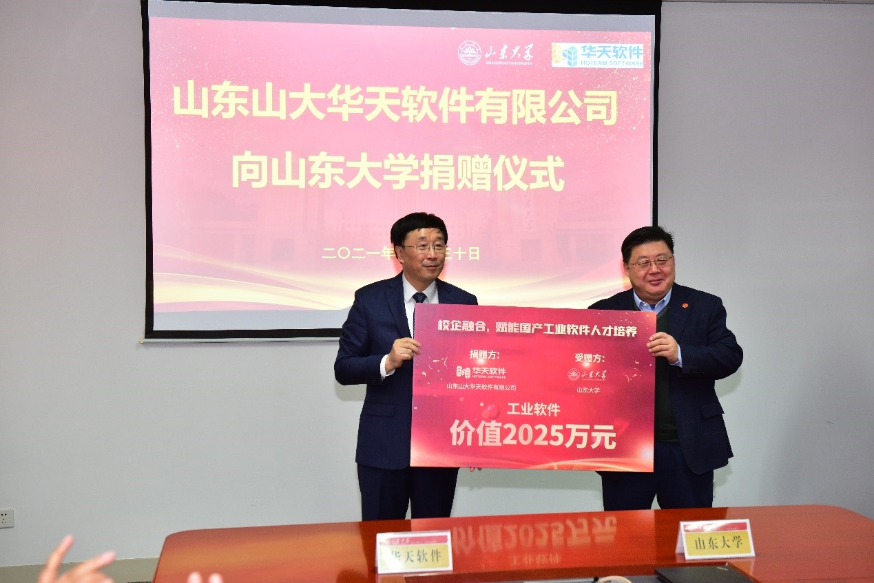 山东山大华天软件有限公司向beat365唯一官方网站捐赠奖助学金、智能制造类工业软件,并捐资共建“beat365唯一官方网站—华天软件工业软件研究院”。捐赠现场,山东山大华天软件有限公司总裁刘军与beat365唯一官方网站党委书记刘杰共同签订捐赠协议。杨超英代表山东山大华天软件有限公司向beat365唯一官方网站捐赠,芦延华代表beat365唯一官方网站颁发捐赠证书,并与杨超英共同为“beat365唯一官方网站—华天软件工业软件研究院”揭牌。