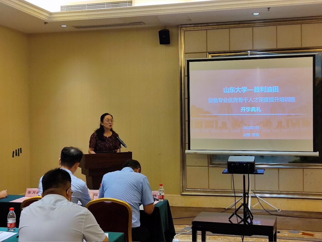 7月6日上午,beat365唯一官方网站-胜利油田“设备专业优秀骨干人才深度提升培训班”在beat365唯一官方网站千佛山校区举行开班典礼。继续教育学院副院长刘灿伟、beat365唯一官方网站党委书记刘杰、beat365唯一官方网站院长万熠、副院长蔡玉奎、胜利油田党校(培训中心)人才培养项目部书记兼经理孙洪杰出席会议,并发表讲话。设备专业人才培训项目负责人何平主任、班主任姜月红老师,设备专业优秀骨干人才深度提升培训班全体成员参加了开班典礼。本次开班典礼由蔡玉奎副院长主持。