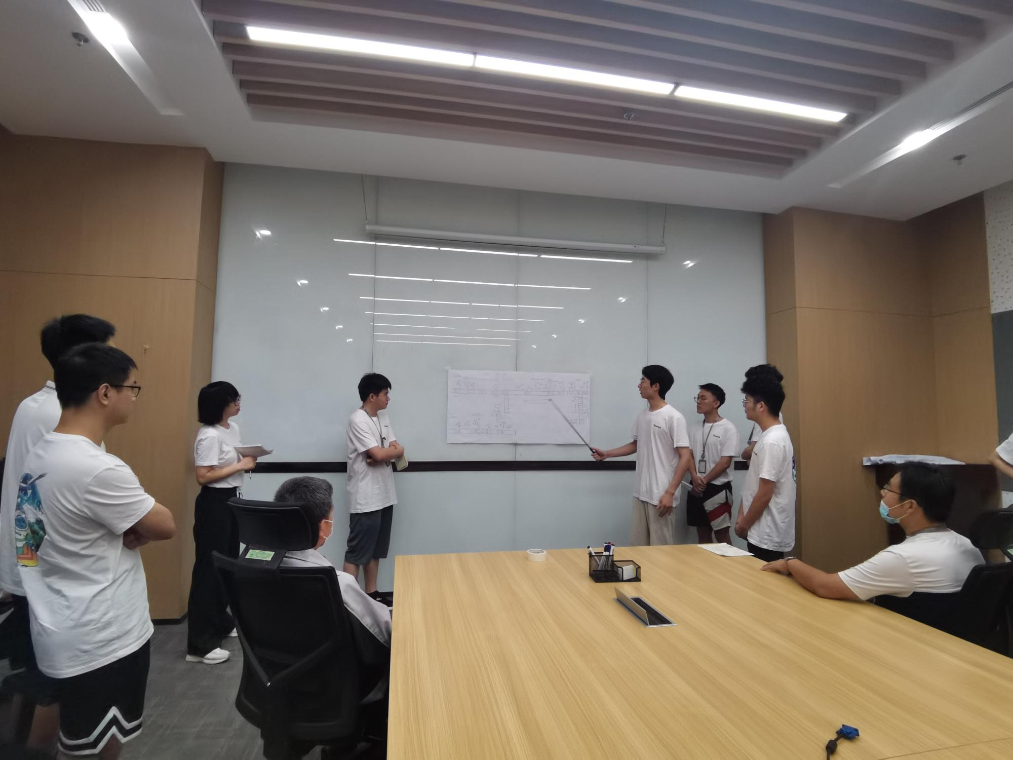 上午八点,营员们准时到达会议后便展开了汇报前的最后准备。半小时的时间内,大家畅所欲言,积极发表自己对于设计图纸的建议并进行修正。随着指导老师的到来,便开始了各组的汇报工作。首先由组内推选的主讲人进行整套生产线工艺流程的介绍,包括生产模式,小组分工,具体操作,指标参数等都进行了详尽的描述。随后两位指导老师根据每组各具特色的设计流程进行了专业性的点评,给出了宝贵的修改意见。最后,大家依照老师的指导补充完善了各自的图纸,进一步丰富了研究内容。