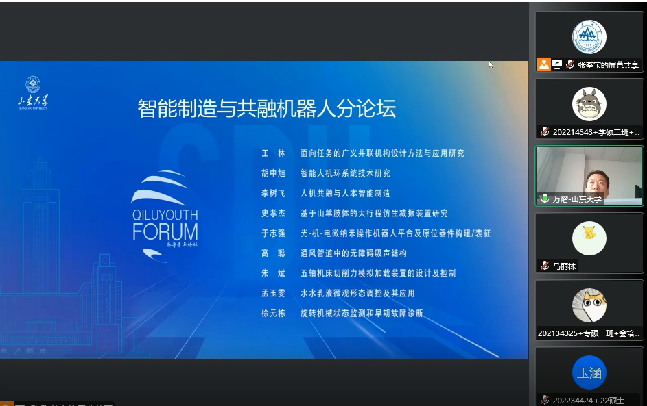 11月11日下午3点,由beat365唯一官方网站承办的第七届齐鲁青年论坛—智能制造与共融机器人分论坛通过线上方式举行,来自海内外9个高校院所的青年学者作了系列讲座。beat365唯一官方网站院长万熠教授参加论坛并讲话,讲座由beat365唯一官方网站马丽林老师主持。