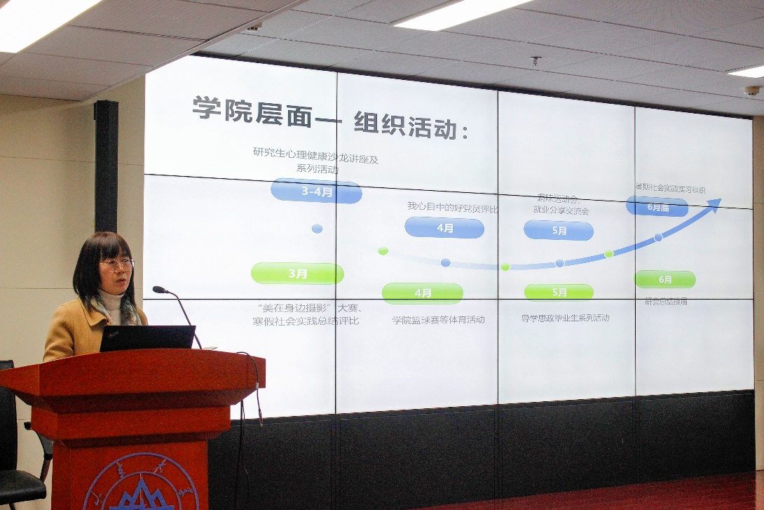 随后宋小霞为大家梳理了有关安全教育、荣誉奖励、心理健康、科研竞赛、学术能力和就业实践六大春季学期工作要点,并分别从学校和学院两个层面展示了本学期研究生活动清单,鼓励大家在做好相关科研工作的同时积极参加学院活动,促进良好人际关系的形成,营造活跃健康的学习生活氛围。
