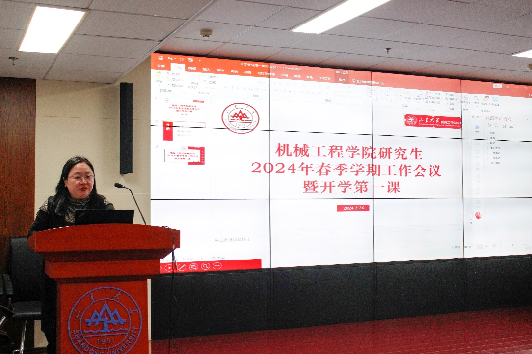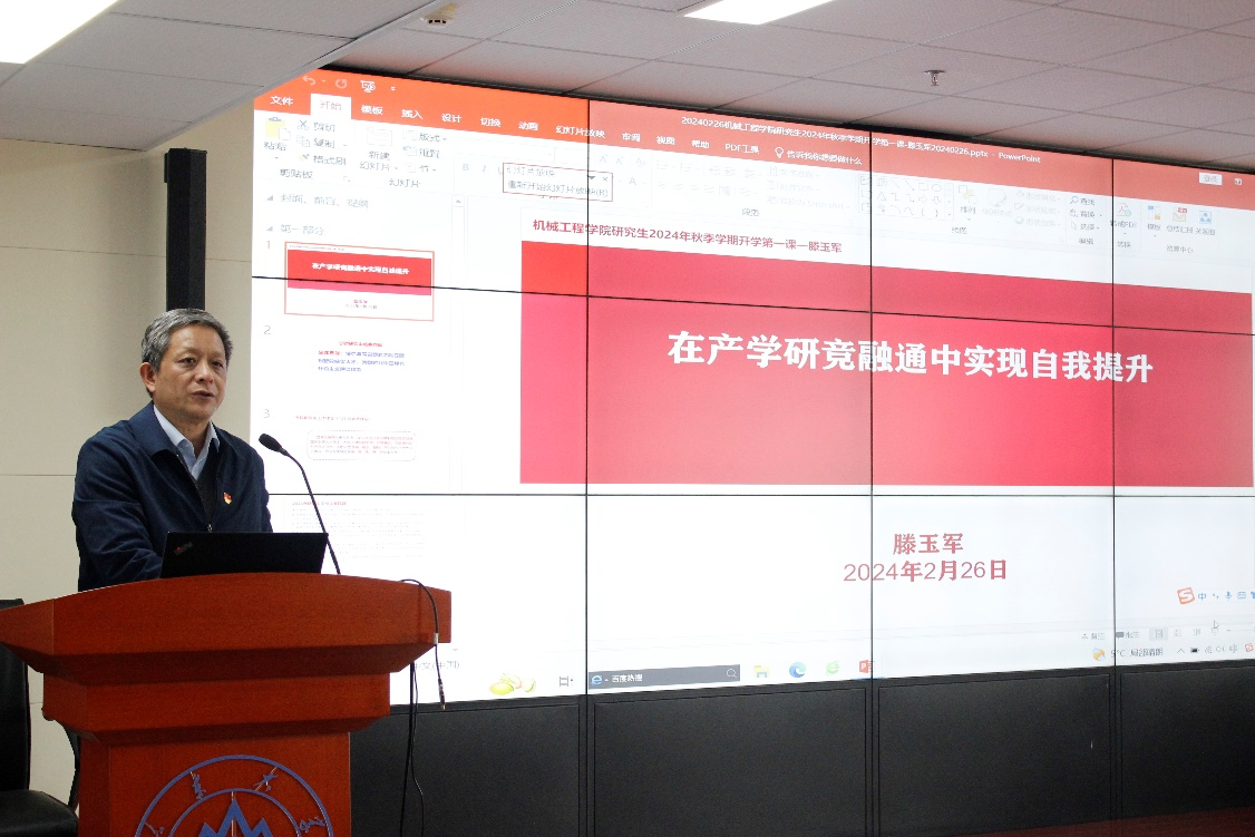 会议伊始,滕玉军讲授题为“在产学研竞融通中实现自我提升”的开学第一课。他从思政教育工作者的角度出发,结合自身工作经历和感悟,为大家剖析了当前面临的国内外大环境大背景,阐明产学研竞融通对研究生培养教育的重要意义。回顾了2023年学院研究生工作,指出了当前学院研究生工作存在的主要问题,提出了2024年学院研究生工作思路和八个方面的主要工作。